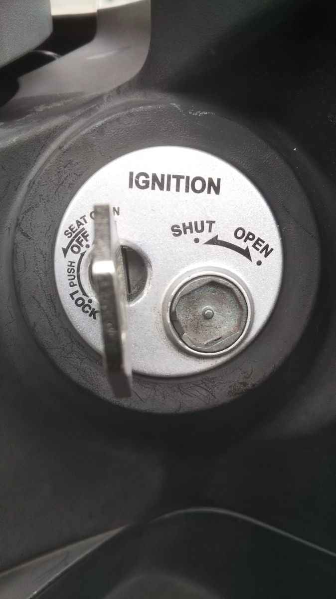 鍵をシートに入れてシートを閉めてしまったとの電話です。一昔前のバイク車種のシートインロックとかだとシート、ハンドル、メット、ガソリン等色々な箇所に鍵が付いていてピッキングで解錠できていましたが最近販売されているバイクだとほとんど一カ所しか鍵が付いていない場合が多く、その一カ所で全ての操作ができるような仕組みになっております。そしてシートはピッキングで解錠できないような仕組みになっているため鍵を製作して解錠を行うことになります。また最近の原付(今回は2年落ち)の鍵は長くなっていて製作が難しくなっております。機械的な部分では最近の大型バイクと製作難易度はほぼ変わりはありません。しかも・・・
