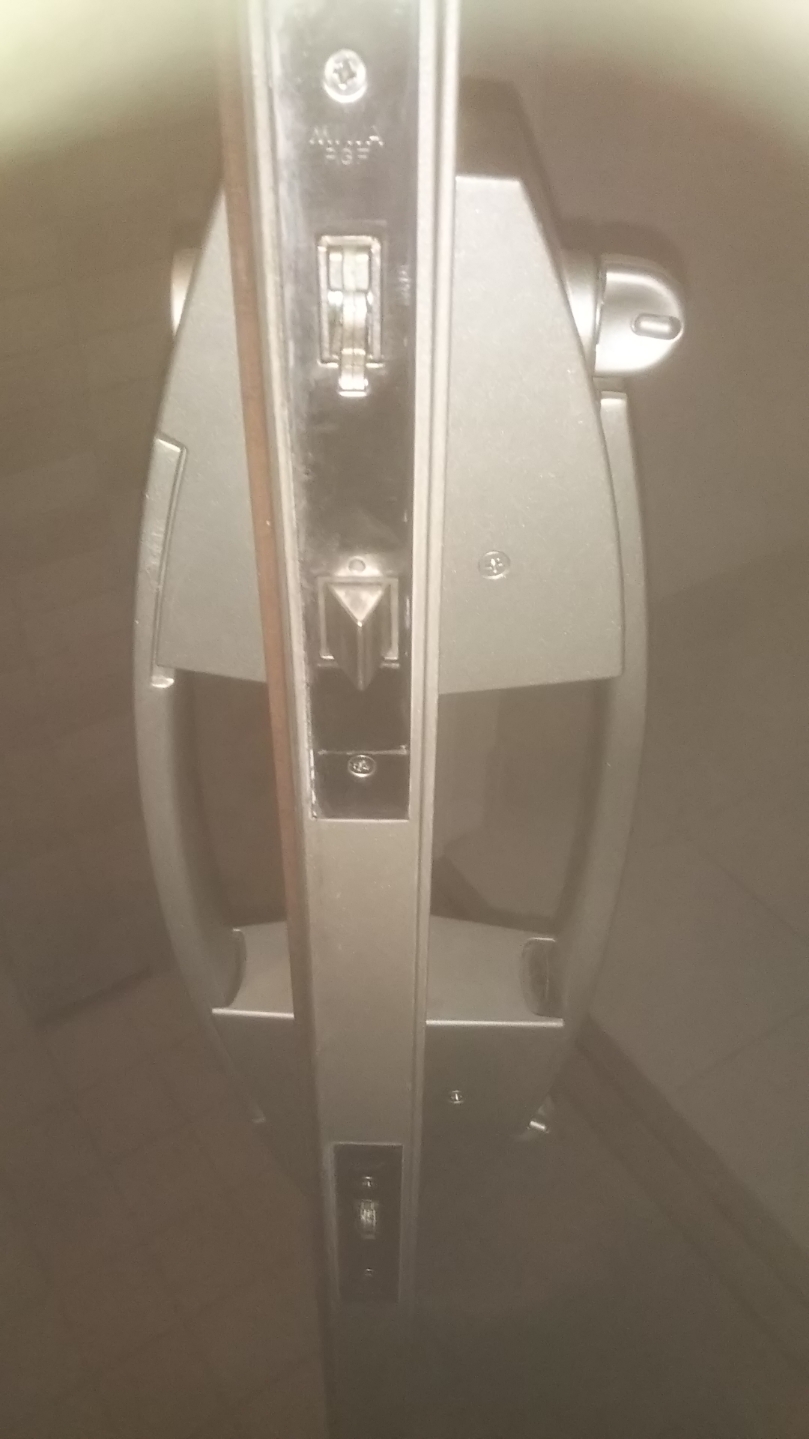 玄関を開けられないとの電話です。現場に伺ってみると裏窓が開いている状態で室内には入れるけども室外からも室内からも玄関を開けられない状態です。色々と調べてみると内部に入っているケースに異常が発生している状態です。こういった場合、結構壊さなければ開錠出来ない場合も多いですが今回は解錠成功です。分解したケースを確認してみると部品の摩耗が激しく(ラッチが衝撃で動き)持続不可状態です。(今回はまた同じ状態になる可能性が高い)ので交換する事になります。そのため変な位置で停止中(写真)あまり普及していないケースでしたが在庫がありましたのですぐに交換、玄関の開閉は通常通りの作動に戻りました