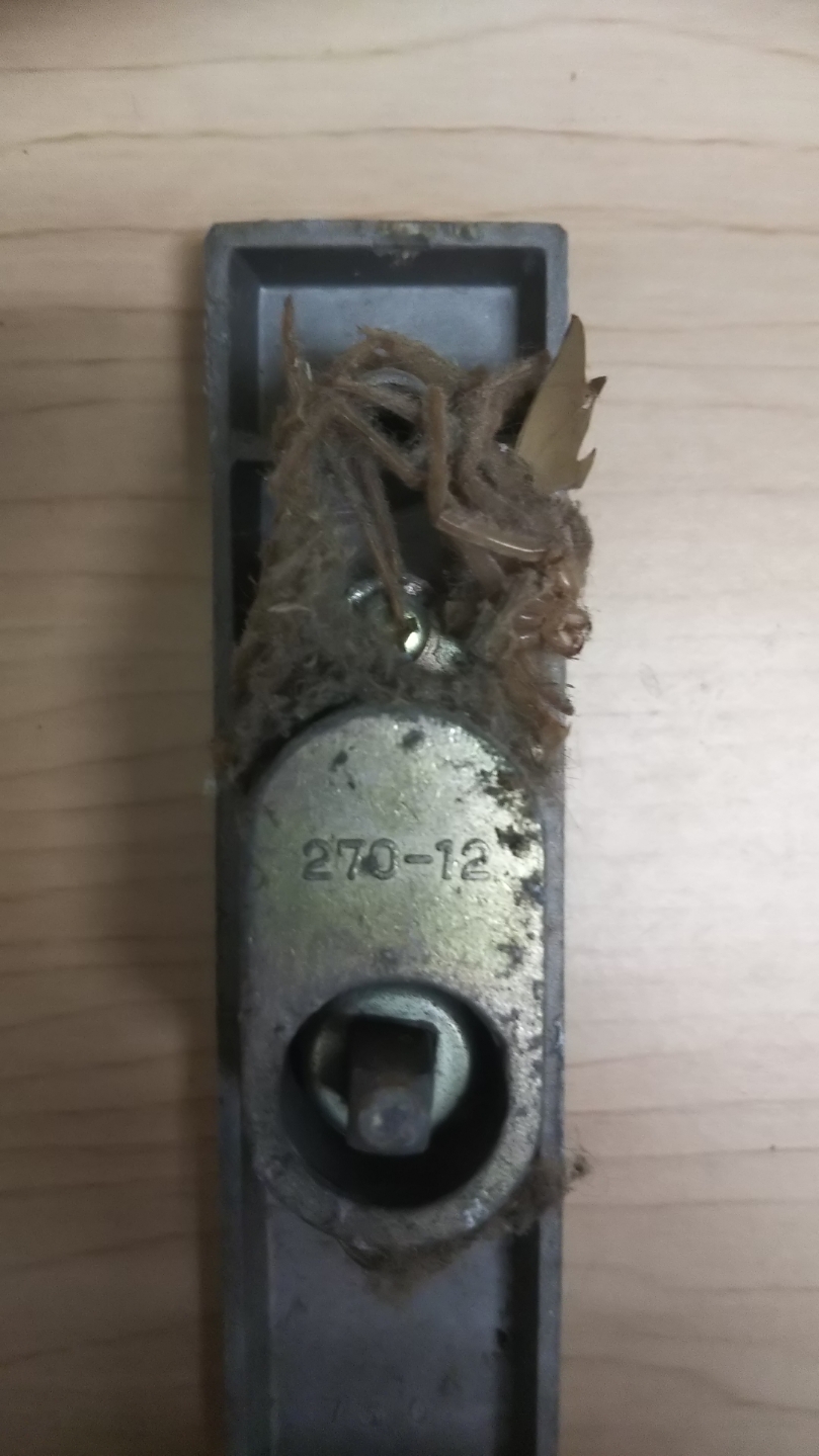 鍵交換を依頼されて色々な場所にお伺いしております当方ですが特に田舎の地域だと結構な確率で錠部分に虫の死骸が付着している場合が多いです。特に多いのがクモ、ゴキブリ、蛾等ですかねぇ、よくあんな狭い部分に入り込めたなぁと思いますが、内部に入り込めたのはいいが今度は外に出られなくなる場合が多いんでしょうねぇ、そこで死亡、ある程度の空間がある所に死骸があるので鍵の開閉にさほど影響は与えないんで誰も気づかずに使用継続、別の箇所に鍵の不具合が起こった場合、あらためて錠を分解する事があるのでその時に気づかれる(写真)ぎょっと!