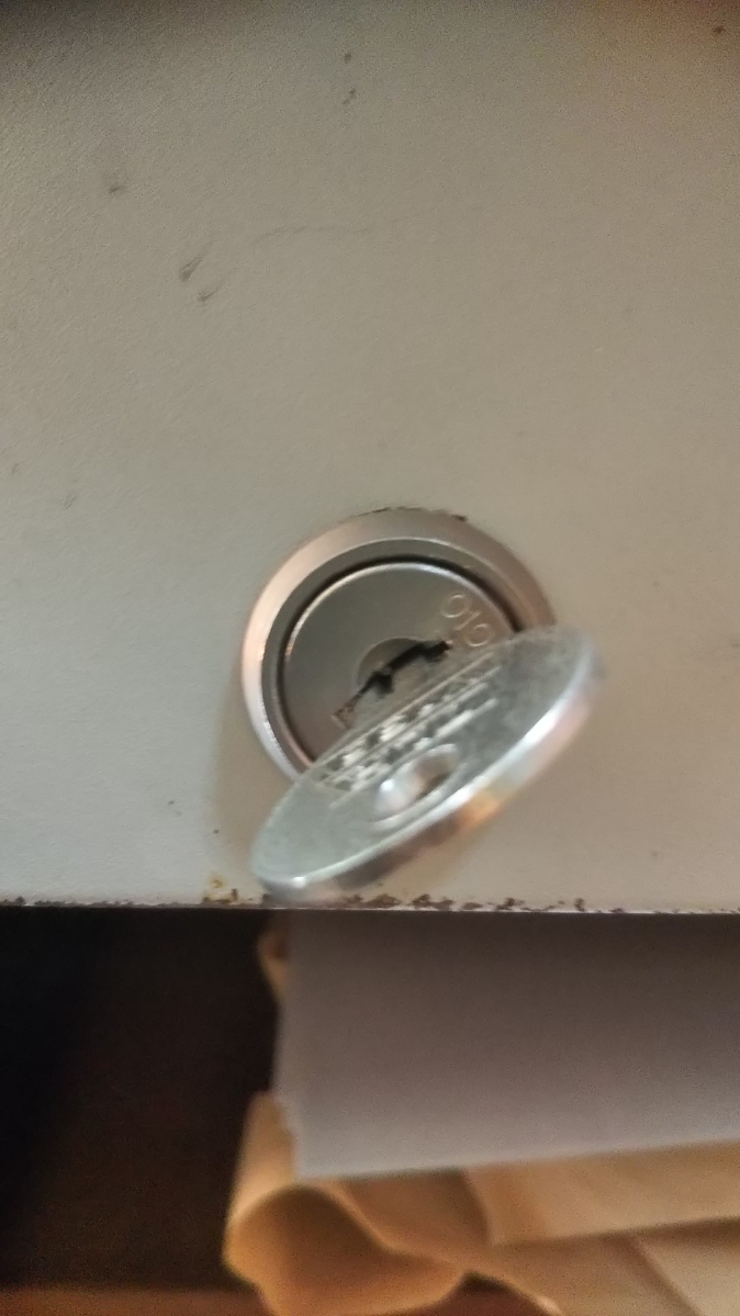 (棚の鍵の開閉ができなくなったので修理するか交換して欲しい)との電話です。現場で見てみるとあまり普及していないような錠ですね。気になったのは棚が異常に変型しています(写真)今まで相当使いづらい状態ではなかったのでしょうか?相当錠にストレスが掛かっていたのでしょう色々と試してみましたが錠は全く動かず壊れています(修理不可)の様子です。在庫があるか調べてみると似たような構造の錠を発見、ただ持ち合わせの錠のサイズが若干大きいです。通常では取り付けできないようなので棚を加工して取り付け、完了後開閉を確認してみると通常通り鍵の開閉可能な状態になりました。完了です