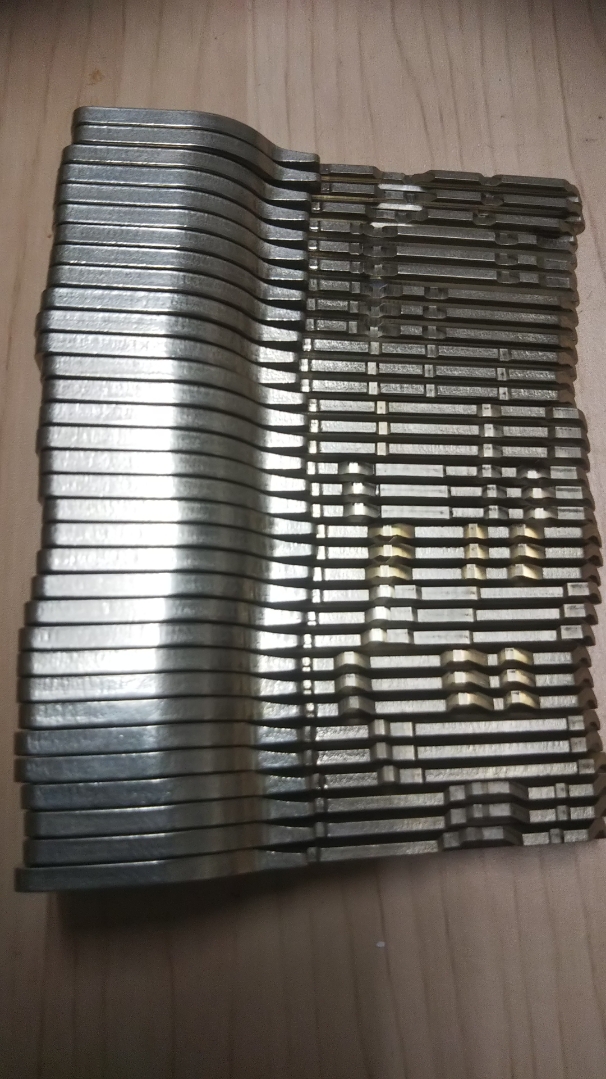 たまに当店に持ってこられる鍵ですが基本ブランクキーや固定治具がないので作成不可能となっております。なのでたぶん製品を商品化しているメーカー以外はどこも作製したことがないと思います。(試みた方々はいるかもしれませんが完成まではいってないと思います?)メーカーも大量生産で製品を製作する設備があると思われますのでそこで自動化、量産、作製されています。ただ依頼があるのでどの位難解なのか当方で一から作製してみることにしてみました(写真)段階的にはブランクキーと固定治具を製作しなければこの棒状ディンプルキーは作製できません。次回に続く