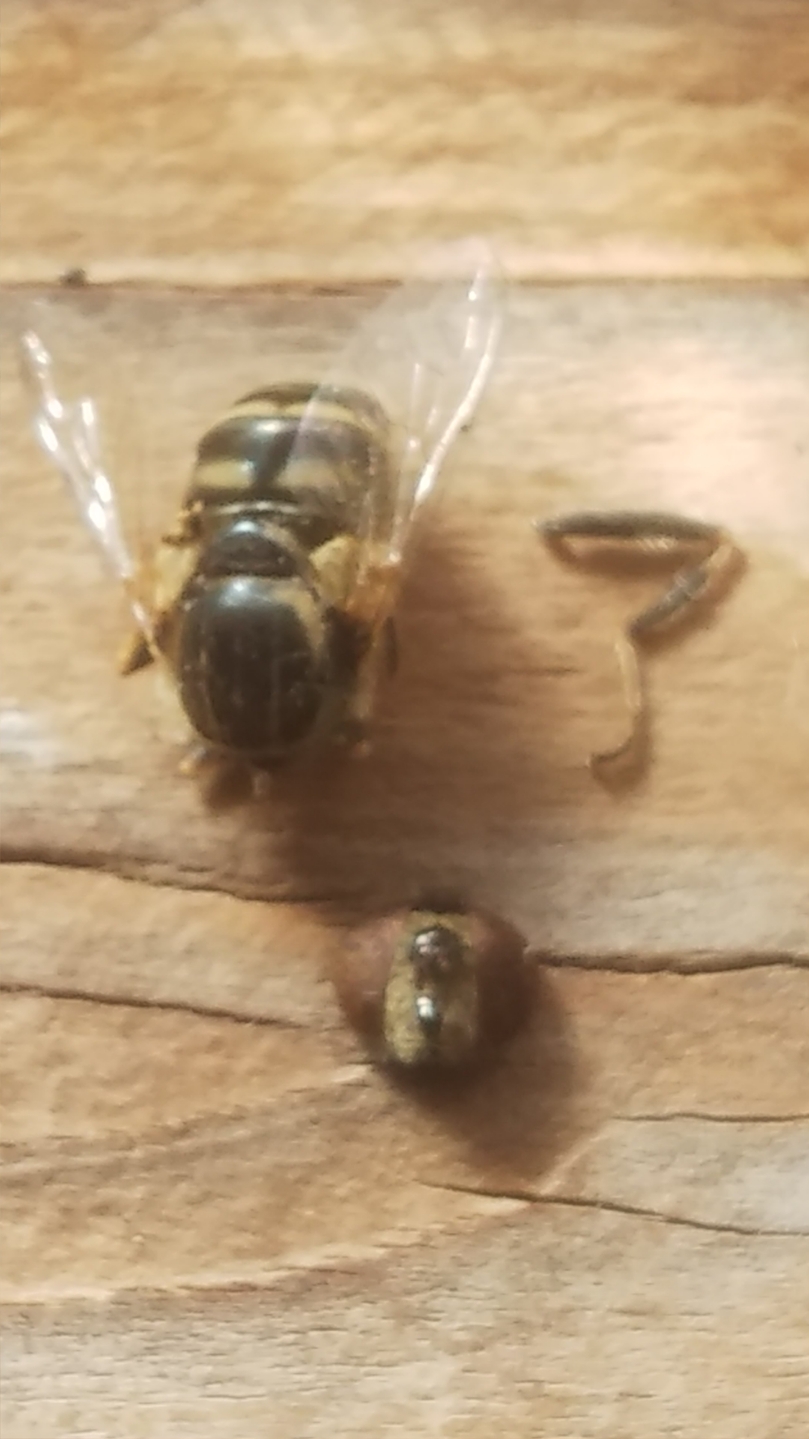 先週のミツバチは見当たらなくなりましたが今度は大きいサイズのスズメバチが見られるようになりました。巣を乗っ取られたのか?強襲されられているのかわかりませんが結構な数のスズメバチが飛び回っております。巣の近くにミツバチの死骸があり首と足が切断させられています!(写真)数日後また確認してみるとまだスズメバチが飛び回っております(どうやら住み着いている様子です)今度はスズメバチ駆除に切り替えて全滅してあげましょう。と言ってももう冬で寒くなると自滅していくらしいのでちょっと待ってみた後、巣を除去すれば完了なのでしょうけど、この家床下に行く方法がないらしいので床に穴を開けていくしかないのか?家主と相談です