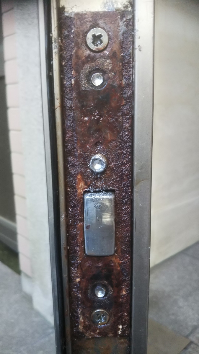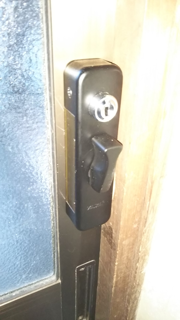 (鍵が壊れてしまって修理か交換かどうにか出来ないか)との電話です。現場で見てみると(写真)部品が取れています。修理といっても部品がないことには修理が出来ません。住人は鍵の開け閉めをしていたのでしょうか?ということで新たに鍵を取付けることにしました。色々と調べてみるとドアがかなり傾いており一般的な錠前を取付けようとしても前の錠前のサイズがかなり小さいタイプの錠前で中に入っていきません。入っていったとしてもドアが傾いているので鍵の開閉が出来ません。かなりのドアの調整と加工が必要な現場のようです。加工調整完了後、新たに取付けた錠前の開閉状態を確認、スムーズに鍵の開閉が出来るようになりました
