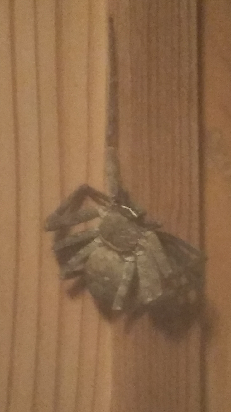 トイレに行こうとしたらアシダカグモが・・・。なんかぶらさがっていますが(写真)全く動きません?むむ?これは死んでいる!何という死に様、ぶらさがったまま死んでいるとは・・・何が原因で死んでしまったのか非常に興味深いですが・・・よく脱皮した殻だけのクモを見ることはありますが今回は殻ではないみたいです本物の(死骸)です。殺虫剤を蒔いた記憶もありませんし・・・天敵に襲われたら体に傷や欠損部分があるはずでしょうけど見ての通り(写真)そういった部分はなさそう?色々と調べてみると水分不足で死亡することがあるみたいですがそれが原因なんでしょうね?