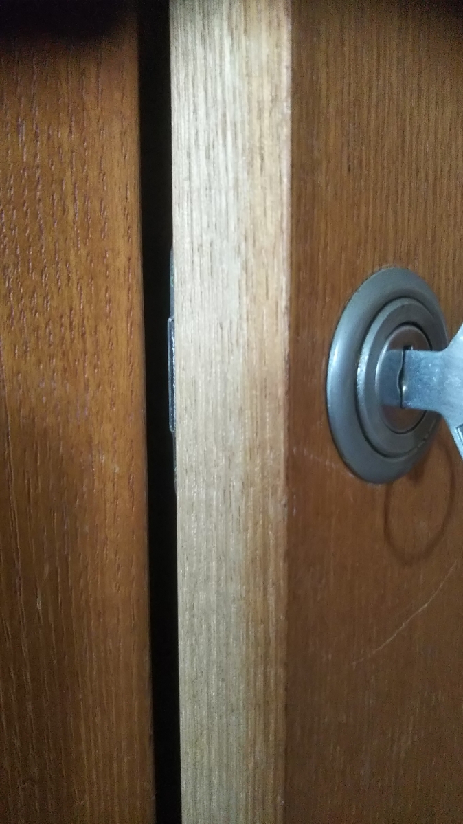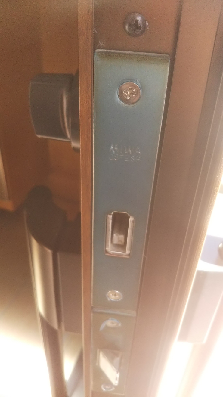 鍵は回るけど鍵の開け閉めが出来ないとの連絡で鍵交換依頼です。現場で確認してみると前にもありましたが引戸のドアで2枚の厚みが違うタイプのドアです(写真)前の事例はドアの厚みが厚いタイプとそれ以上に厚いタイプのドアの組み合わせでしたが今回はドアの厚みが異常に薄いタイプと厚いタイプのドアの組み合わせです。普通に取付けようとしても取り付けできません、何点か錠前を持って行きましたが万能型でも種類によっては取付不可の製品もありました。結構錠前も相性的な物もあるのかもしれませんねぇ?それでも結構なドアの加工と錠前の加工が必要な現場で時間を要しましたが無事開閉良好な状態になりました