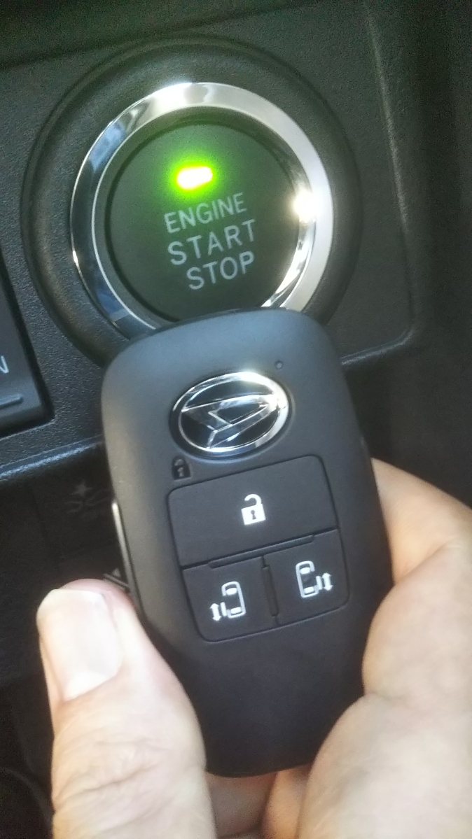 (鍵を紛失してしまって合鍵できますか?)との来店です。鍵を見せてもらうと現行型の鍵です。前に同じタイプのタントを追加したことがありましたので(可能ですよ)と返答(いつ出来ますか?)と言われましたので(すぐに出来ますよ)と返答、車まで行っての登録作業になりました。(予備のメカキーも必要)とのことでメカキーを作成後電子カードキーを登録、もう結構な数の追加作業行っておりますので数分で完了、お客さんにリモコンの操作及びエンジン始動を確認してもらって完了です。この時にメカキーの確認を行うお客さんは少ないので前もって当方で開閉確認した製品を渡しております。プッシュスターターONです(写真)