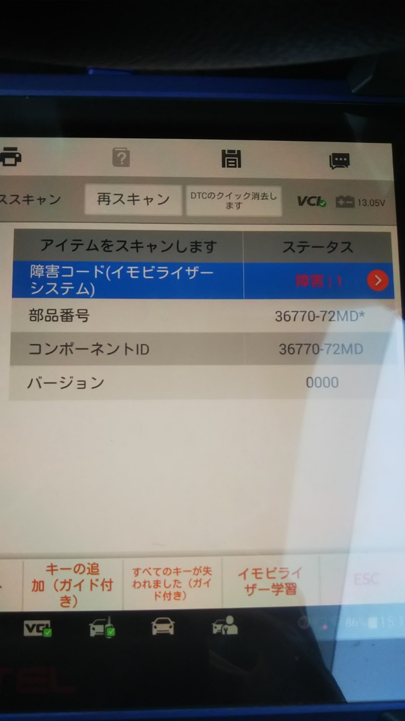当店では高機能のOBD診断機導入致しました。今回はイモビライザーキー追加ご希望のお客さんからの依頼です。現場で確認してみると前まで登録機で出来るかどうか試してみるしかなかったですが前に通信が出来ない車両に当たりそれからは登録する前に車両に不具合がないか診断してから登録するようにしました。今回の車両を診断してみると(障害コードイモビライザーシステム(写真))と表示されています。このコードを消せることもありますが今回は消そうとしても消せませんでした。車両のイモビライザーシステムに異常があるみたいですね?無理に登録しようとすると通信ができなくなる可能性がありますので今回は追加をお断りするという方向で動きました。追加する前に故障箇所を修理及び交換することを提案、それからの追加となります